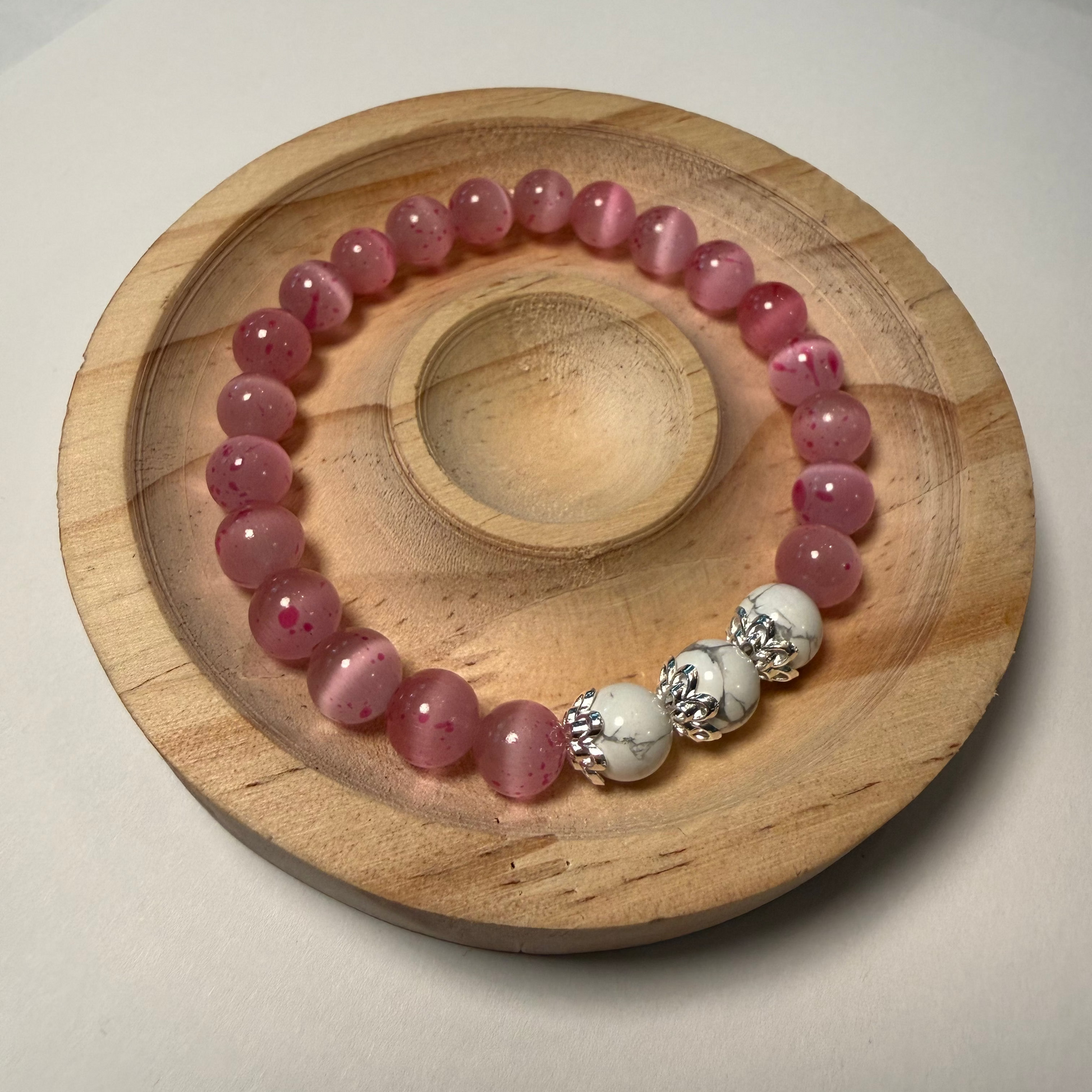This bracelet features 8 mm pink cat eye beads paired with soothing howlite stones, known to help calm your spirit and keep your emotions in check.