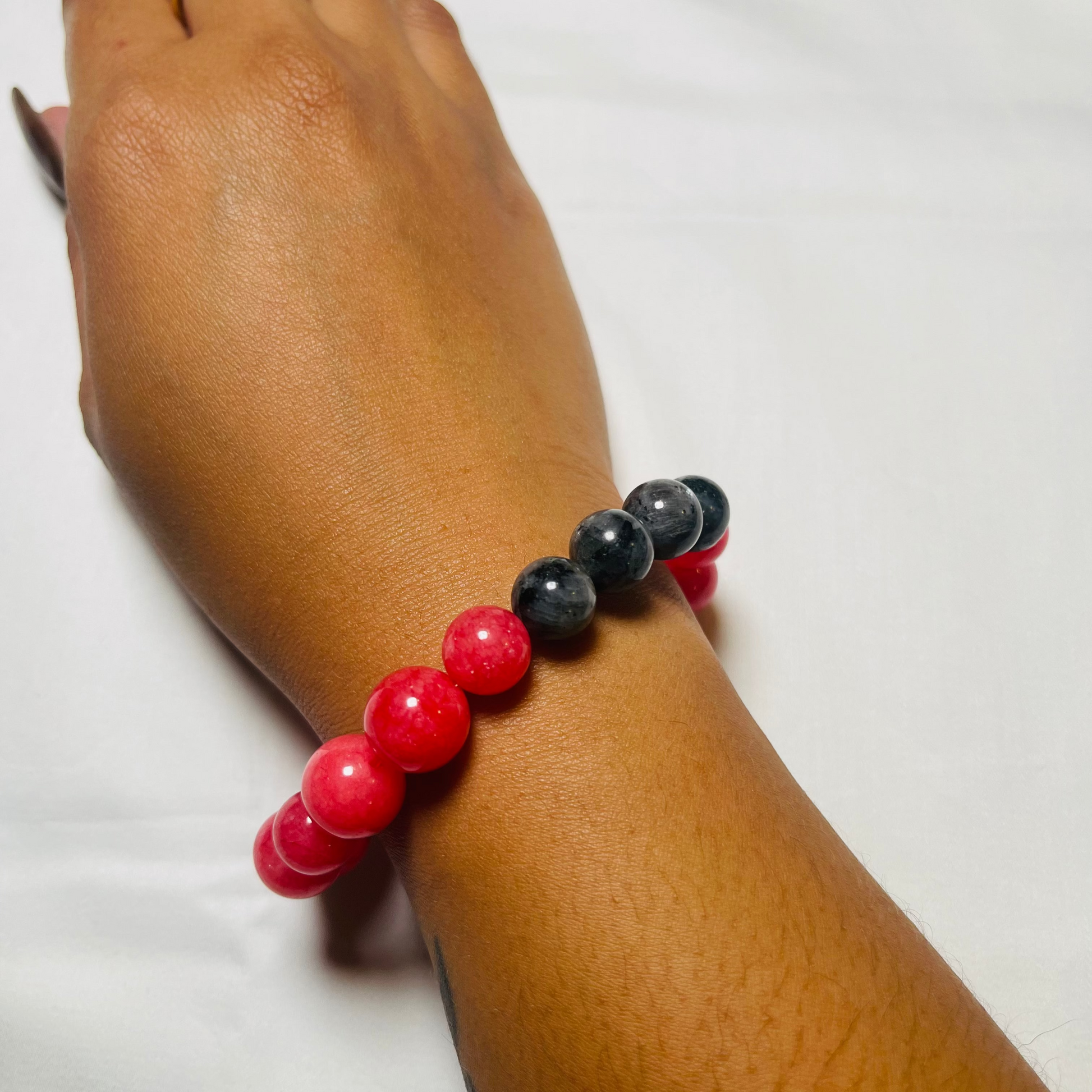 The Wilma bracelet sparkles with 12mm large pink crystal beads paired with sleek gray 10mm beads, all strung together on a fun 7" bracelet. This playful piece adds a cheerful pop of color and charm to your wrist, making every outfit feel brighter and more delightful!